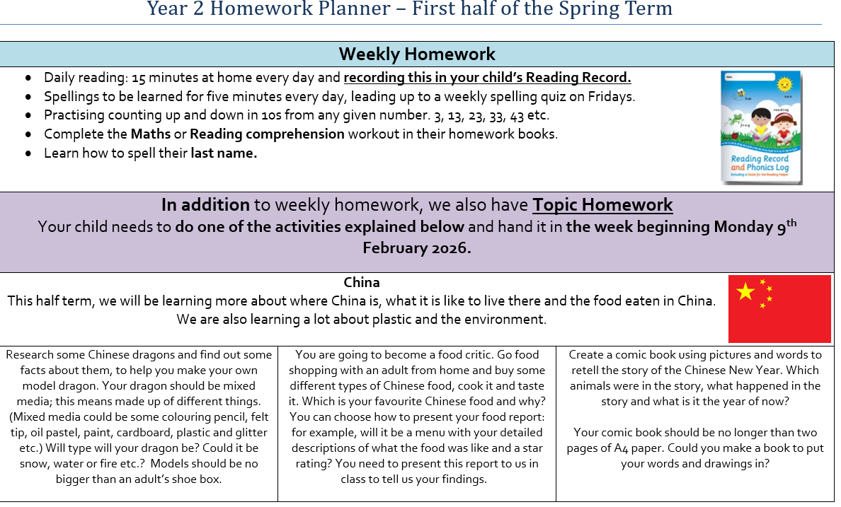 Homework in Year 2 consists of: