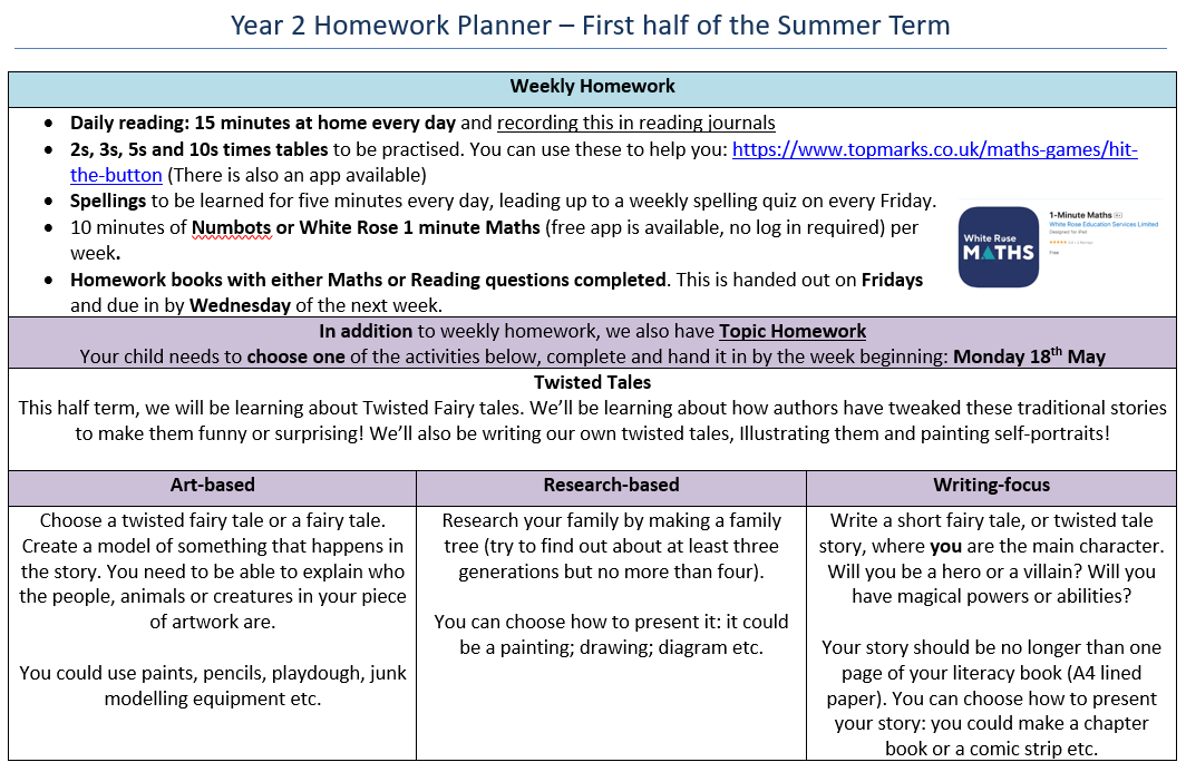 - Choosing one activity from the Topic Homework planner each half-term.